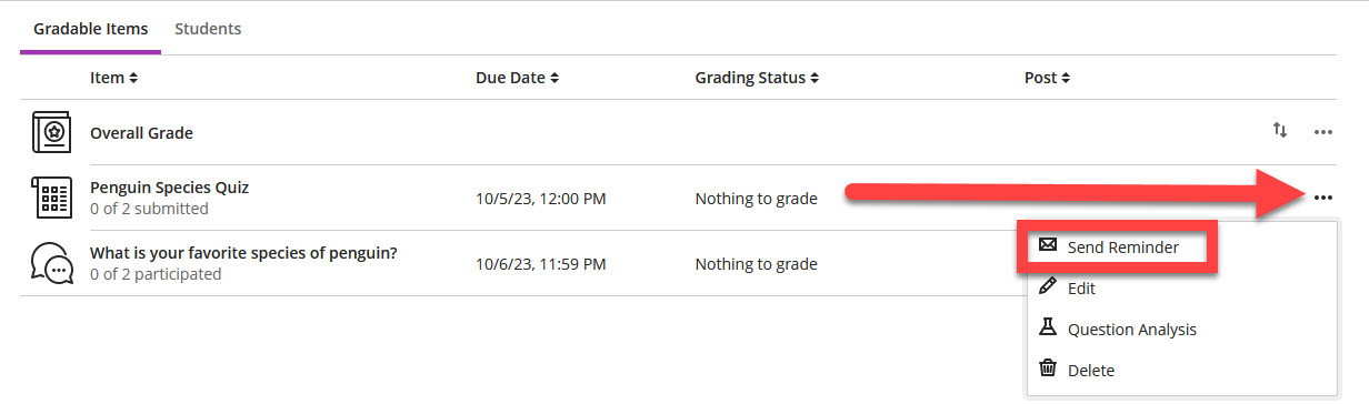 You can now use the “Send Reminder” option to send messages to students who have not yet submitted assignments, tests, or participated in graded discussions. Reminders are sent as a blind carbon copy to non-submitting students or groups as a course message. For anonymous grading, non-submitting students receive the reminder via e-mail to ensure that anonymity is preserved.
